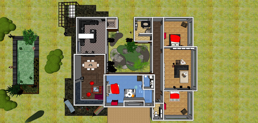 « Intérieur thé » où comment admirer sous différents angles un jardin intérieur minéral dans une maison moderne, à travers de grandes baies vitrées.